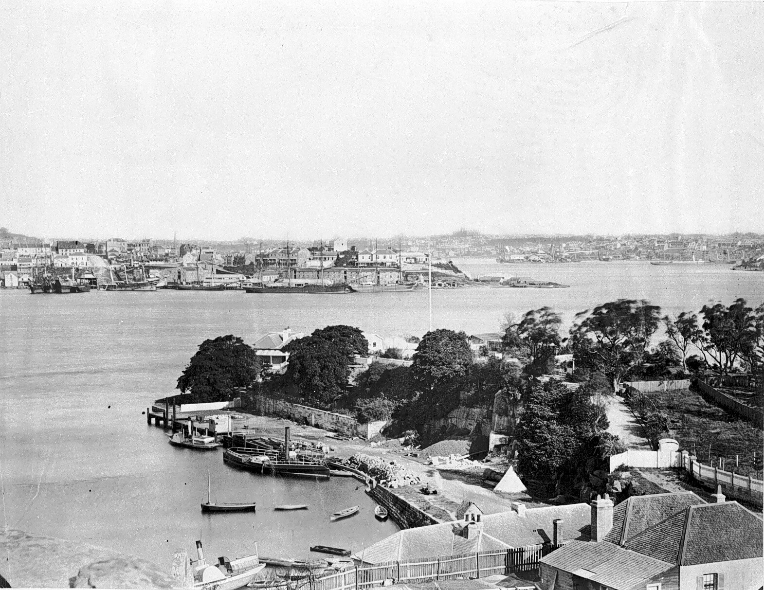 Sydney Harbour. There is a ferry moored in the foreground.