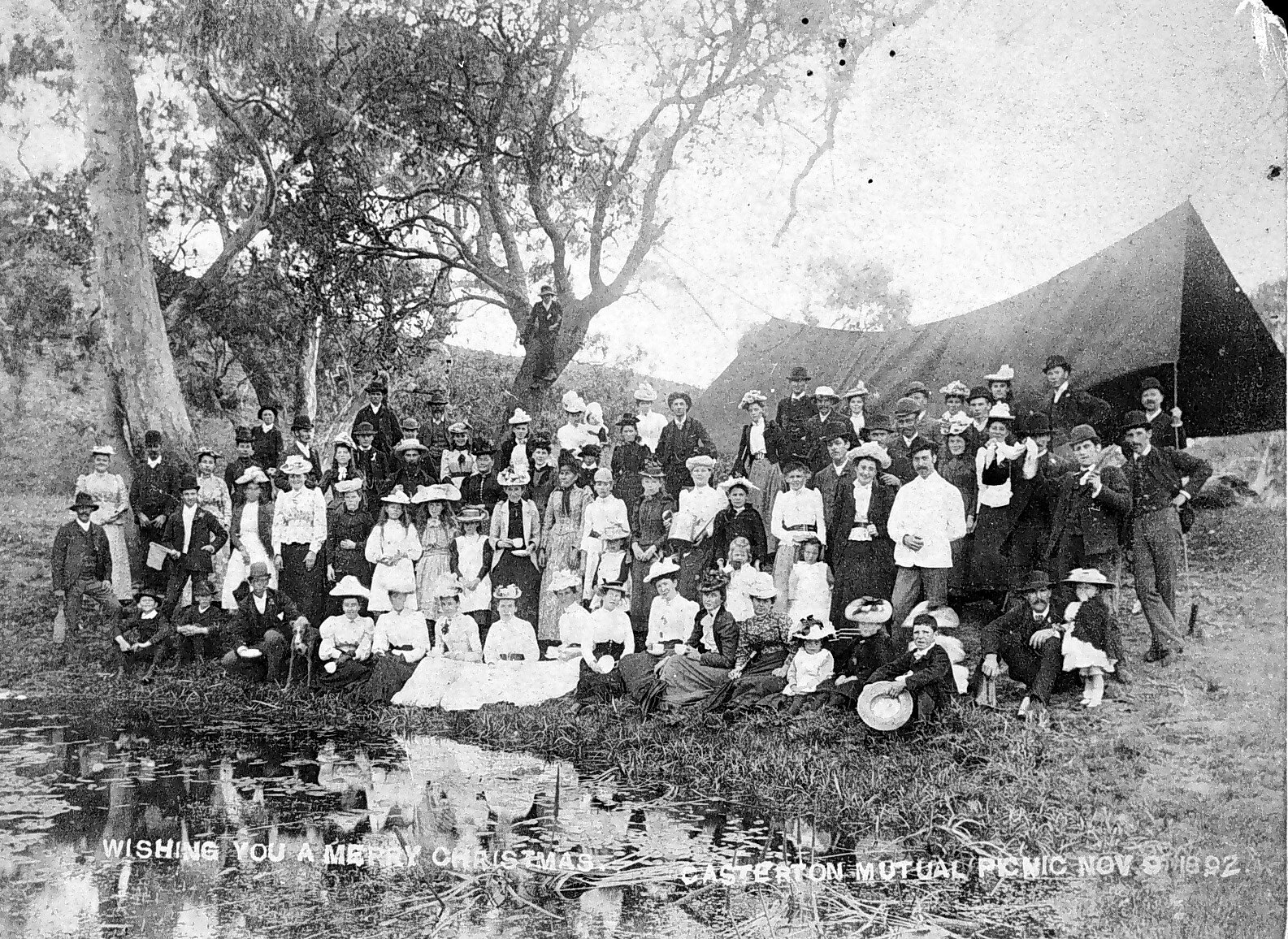 A large group of people at a picnic. They are gathered by a water hole and there is a large tent in the background.