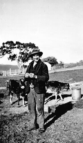 A man rolling a cigarette. He is standing in front of a couple of calves.