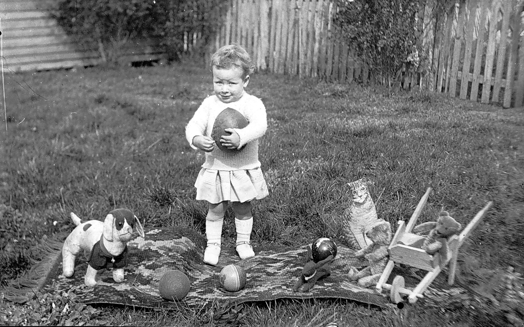 A small boy with his toys in a backyard. He was 1 year and 11 months at the time.