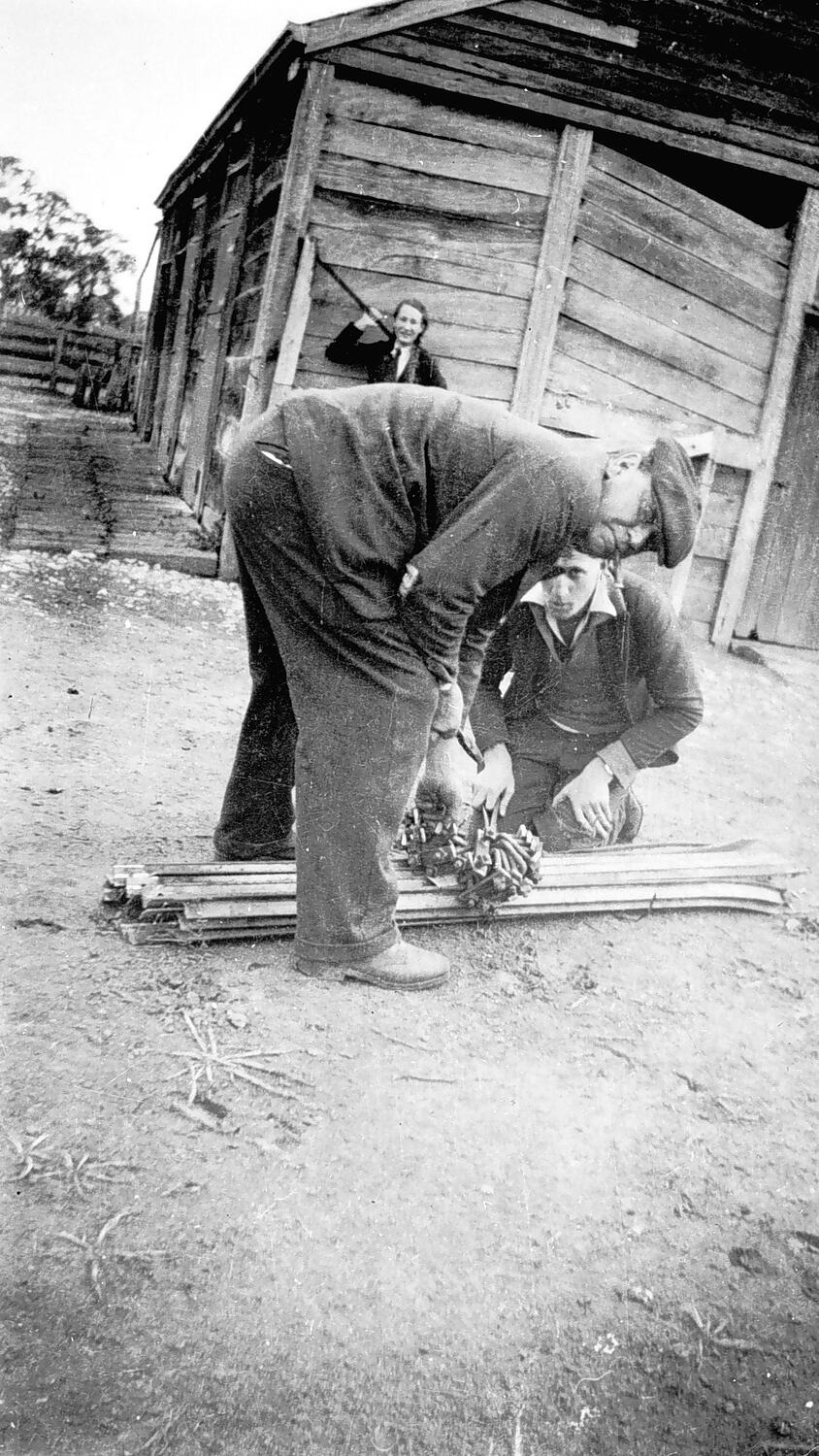 A man, woman and a boy in a farmyard. The man and boy are bending over an unidentified object on a pile of sticks. The woman, in the background, is leaning against a decrepit shed. She is laughing.
