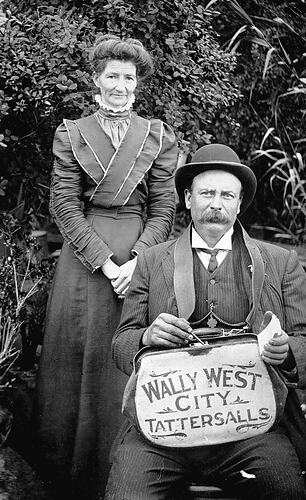 A bookmaker and his wife in a garden. He is holding a bookmaker 's bag with the legend'Wally West, City, Tattersalls'.