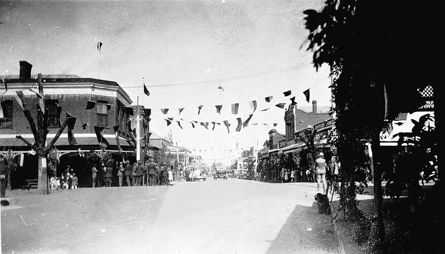 Crowds and bunting in Brookes Street, Inglewood. This may have been for the visit by Mr Bruce.
