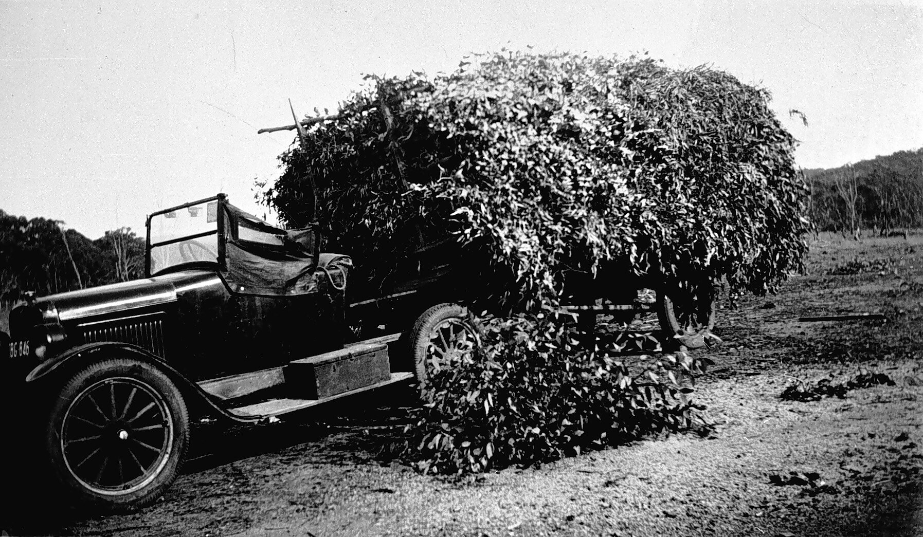 An Overland truck loaded with eucalyptus leaves.
