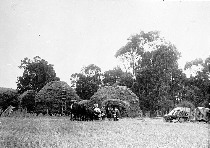 Agricultural Equipment, Agricultural Workers, Drays & Wagons, Farms, Haystacks, Horses, Ladders, Reaper-Binders, Reapers, Strippers