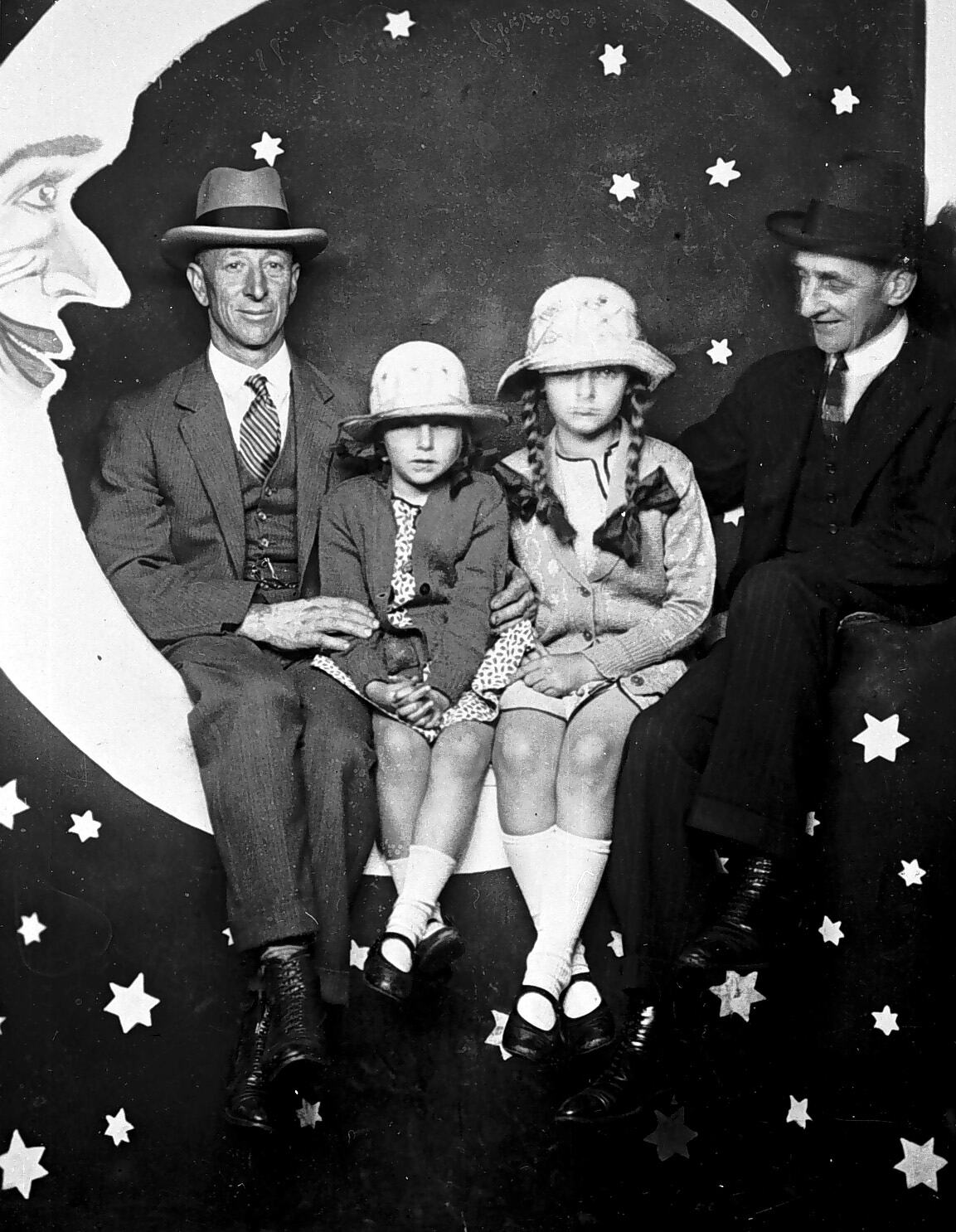 Two men and two small girls at Luna Park. They are sitting on a cut-out moon (moon seat). The girls had been taken to the park as a treat.