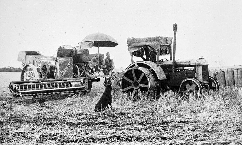Agricultural Equipment, Agricultural Produce, Agricultural Workers, Cereal Crops, Dogs, Domestic Animals, Farms, Harvesters, Sacks, Tractors