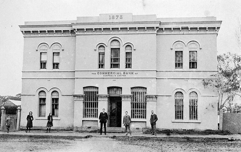 Staff and bystanders outside the Commercial Bank of Australia Ltd.