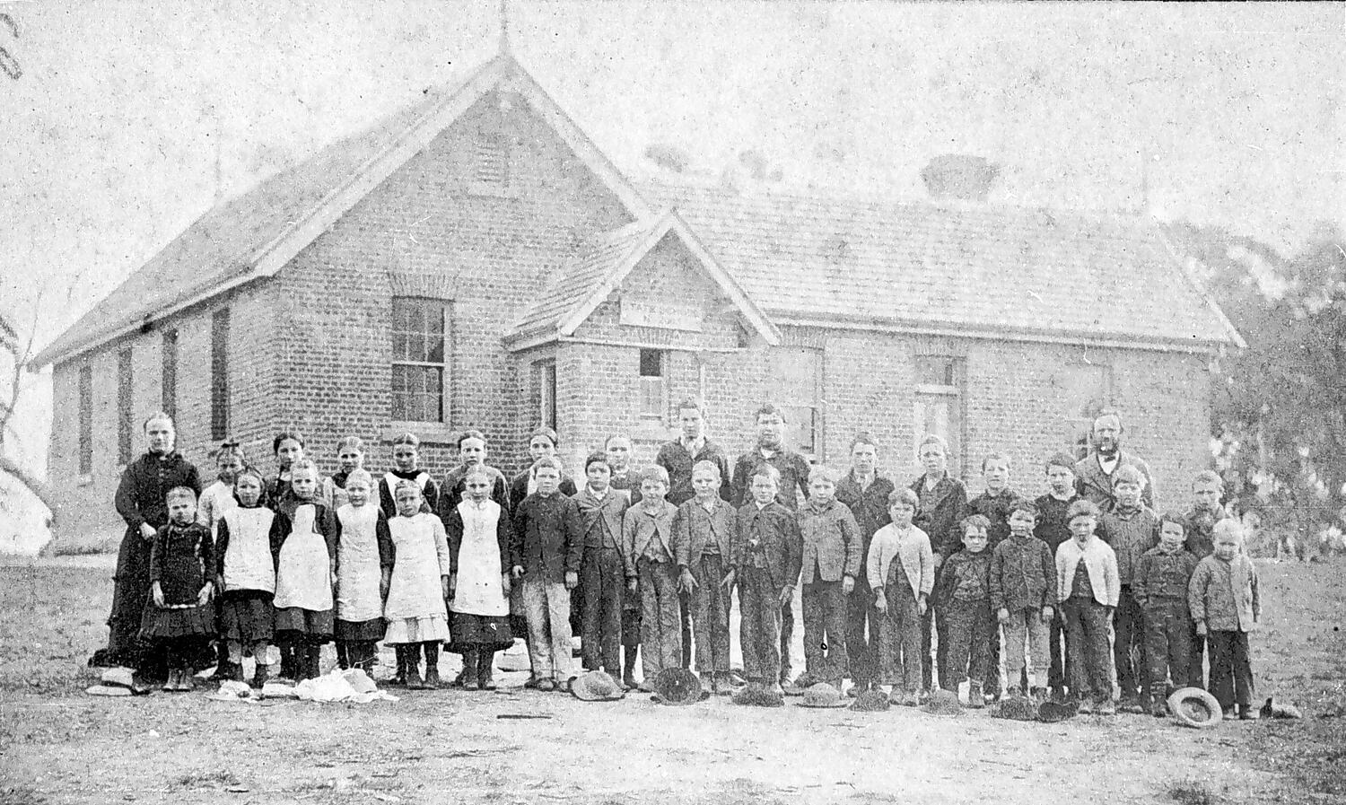 State School pupils and their teachers. Most of the girls wear white aprons and the boys wear their jackets done up at the top. The pupils' hats are lying on the ground in front of the group.