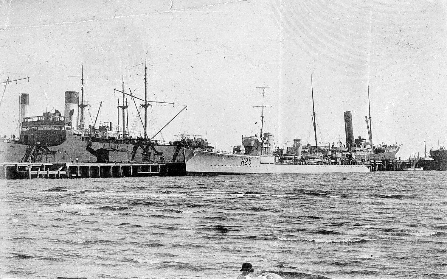 Ships berthed at a Port Melbourne pier - probably the old Hobsons Bay Railway Pier that was replaced by Station Pier in 1930. There is a naval destroyer, HMAS Tasmania (H25), in the foreground.