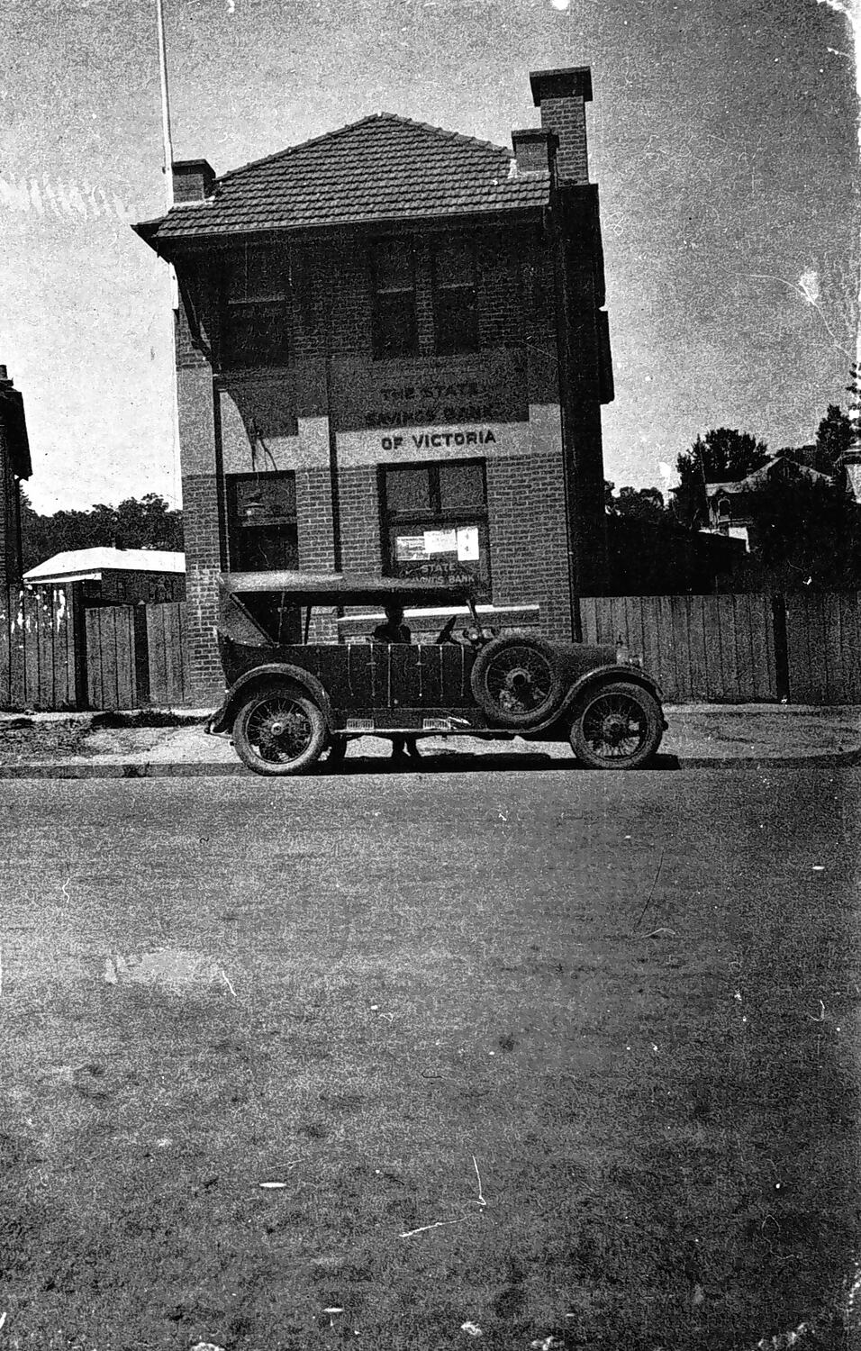 A car parked in front of the State Savings Bank of Victoria.