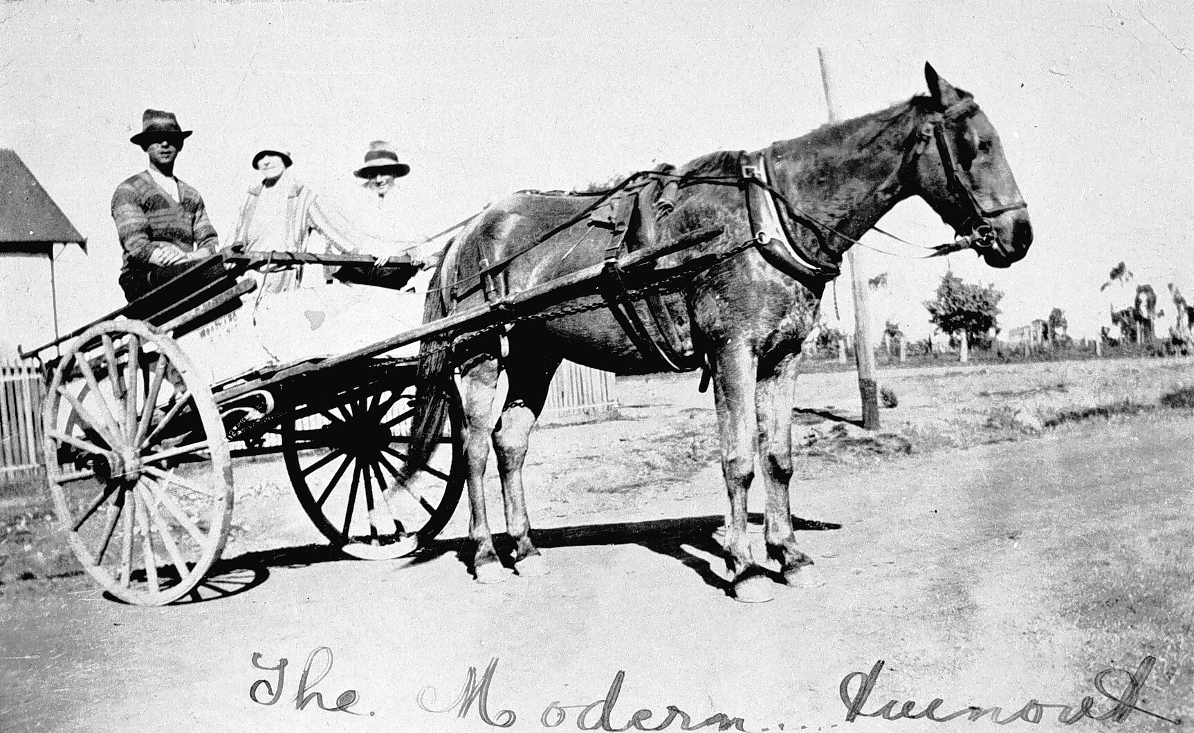 Two men and a woman in a horse and cart.