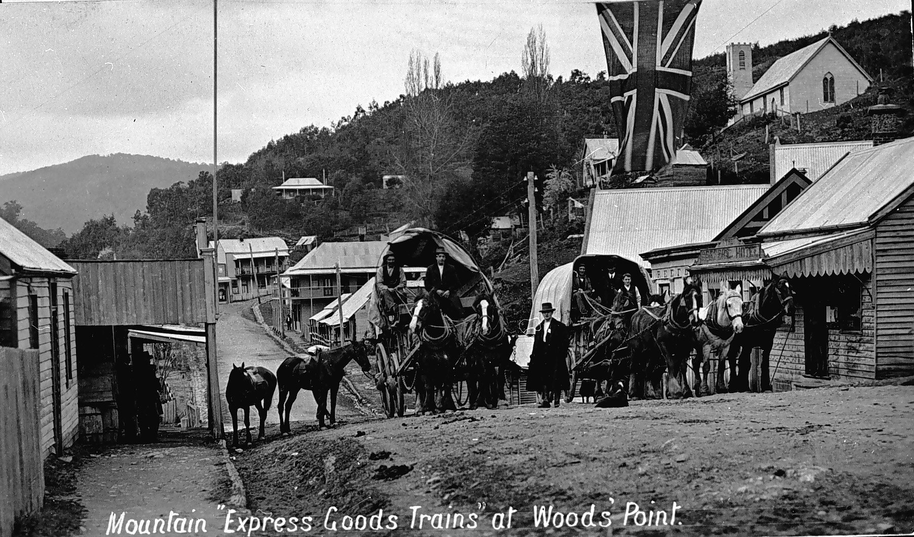 Churches, Dogs, Domestic Animals, Drays & Wagons, Flags, Horsedrawn Vehicles, Horses, Hotels, Telegraph Infrastructure, Telegraph Poles