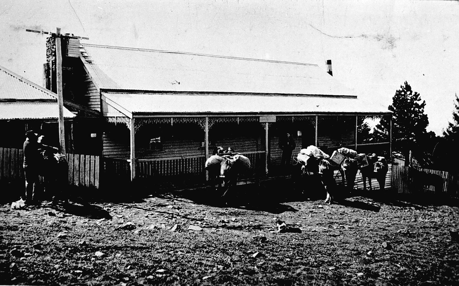 Pack horses stand outside Svenson's Hotel located on a steep sloping hill. The hotel is a single story weatherboard building with a corrugated tin roof and verandah. There are six plain wooden posts supporting the verandah that is decorated with iron lacework. The front of the elevated verandah is boxed with plain palings. The building has four windows and a central door that is reached from the uneven dirt and rocky street via several wooden steps. Three men stand or sit on the verandah and the five horses laden with boxes and packs are tied up in front of the hotel. There is a stone or brick chimney attached to the left of the building and a smaller single story building is close by connected by an extended tin roof eave. A man and his horse stand out front. There is a wooden telegraph pole in front of this building.