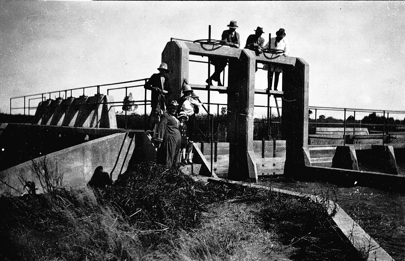 Six people at an irrigation control point.