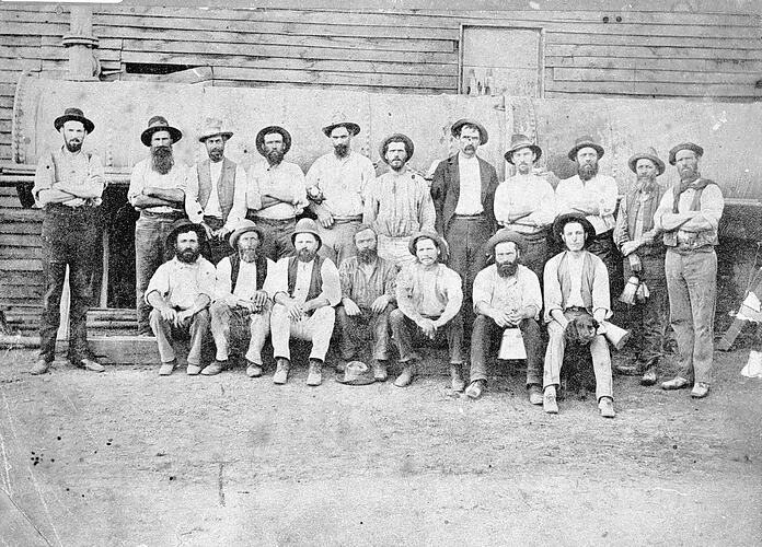 A group of miners at the St Mungo mine. They are standing in front of steam boiler. One man holds a dog.