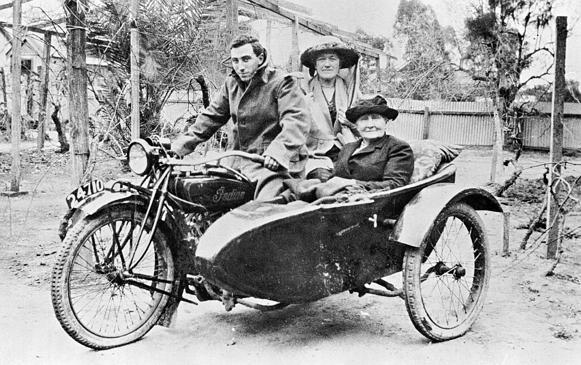 An elderly woman in the sidecar of an Indian motorbike; another woman sits behind the driver.
