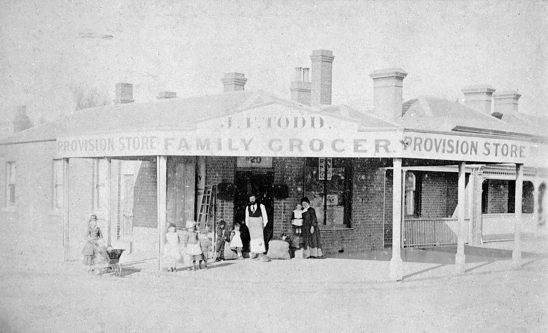 A family outside the shop of J.F. Todd, Family Grocer and Provision Store. There appears to be a woman with a pram to the left of the shop.