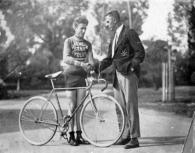 A cyclist, wearing a Malvern Star Cycles sweater, shaking hands with a man wearing a blazer with a 'V' and crossed oars (?) on the pocket.