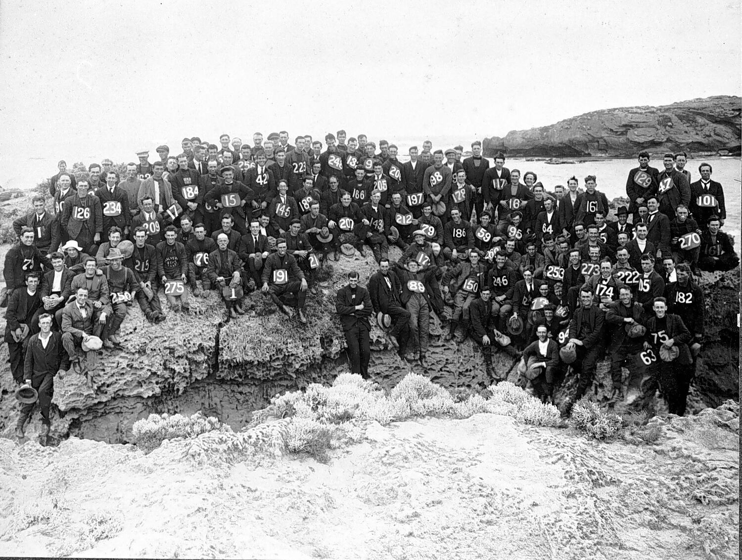 A large group of men posed on a beach rock. They are all holding numbers. It is suggested that they may be competitors in a cycle race.