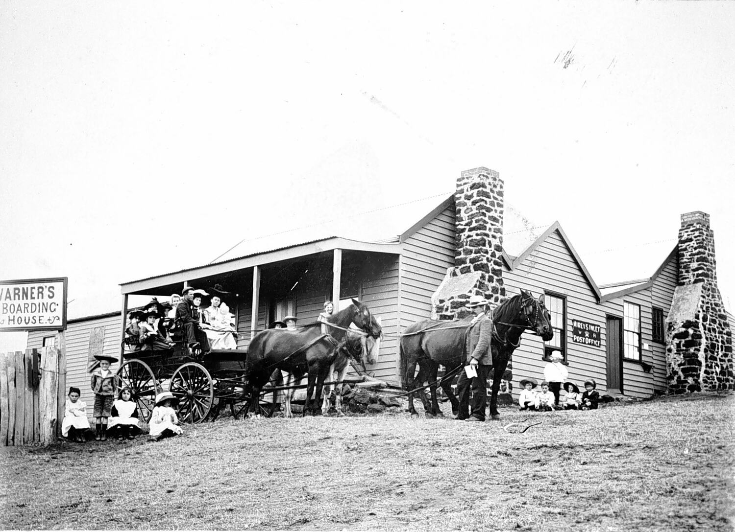 A coach outside the building containing the Airey's Inlet Post Office and Warner 's Boarding House.