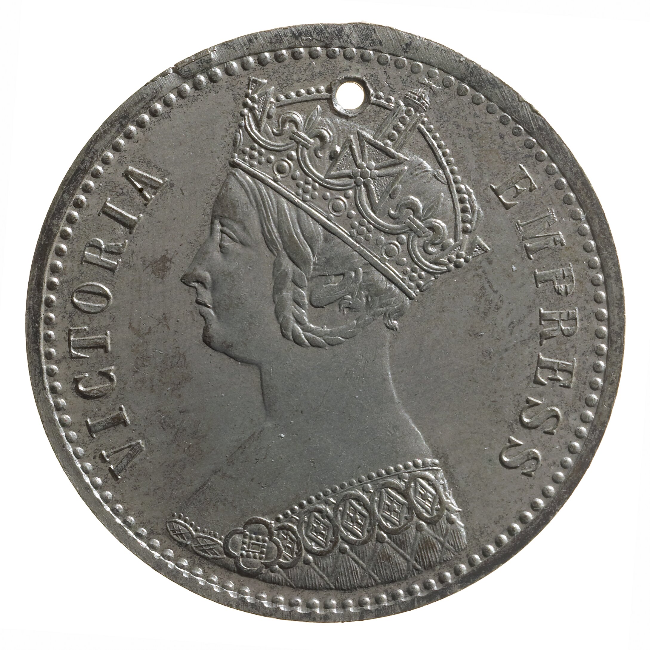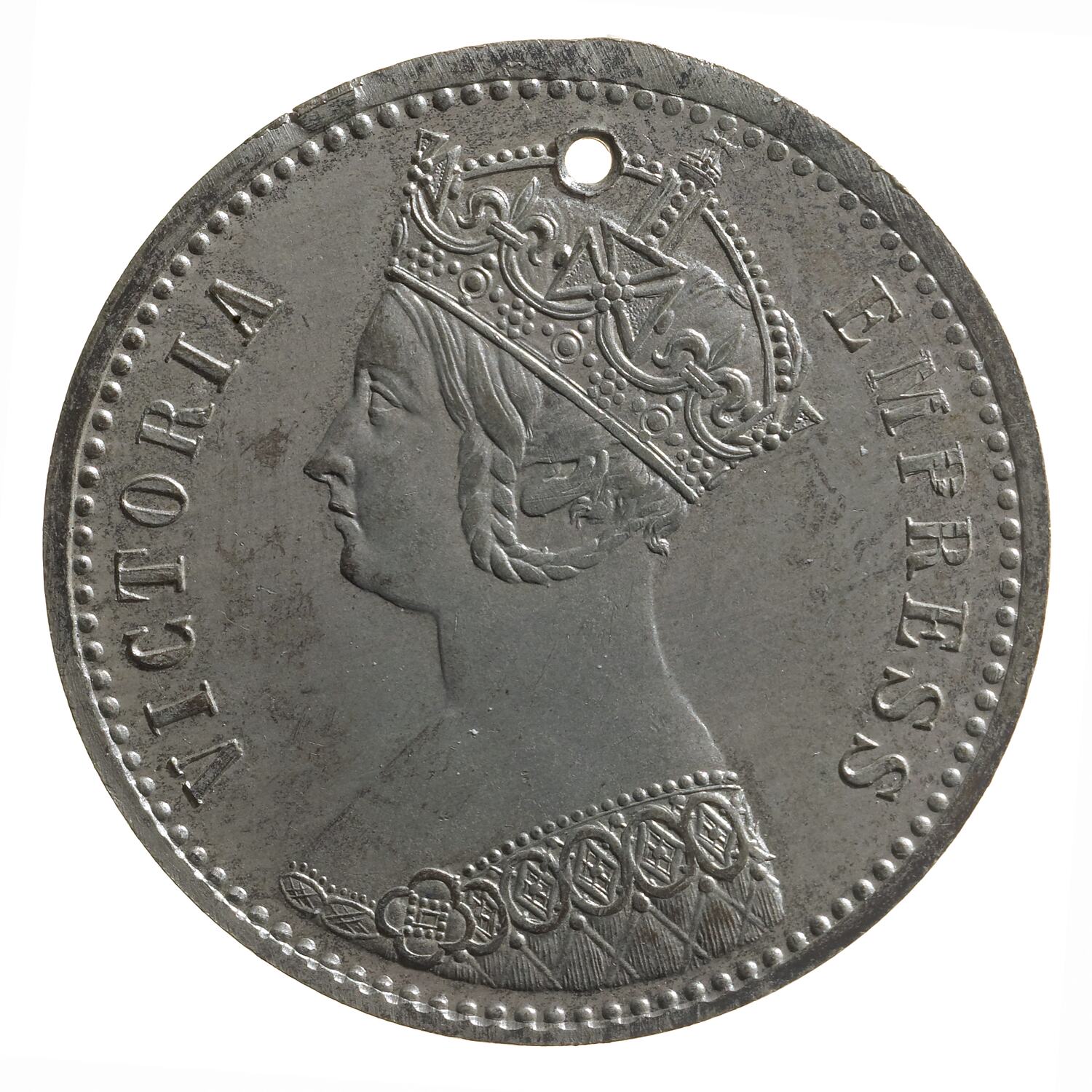 Crowned Gothic bust of Queen Victoria; around, VICTORIA EMPRESS (Based on Indian Rupee or Gothic florin)