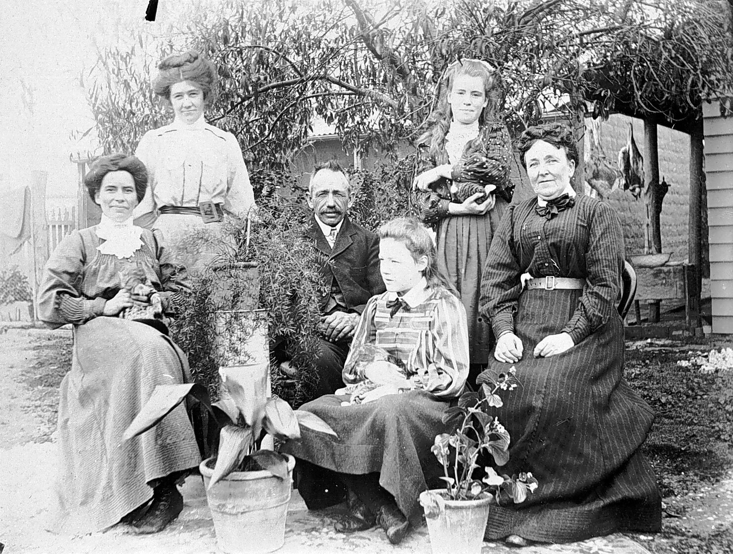 Councillor T.R. Nicholls and his family in their garden. Three of the women hold cats. Note the animals hanging from the verandah.