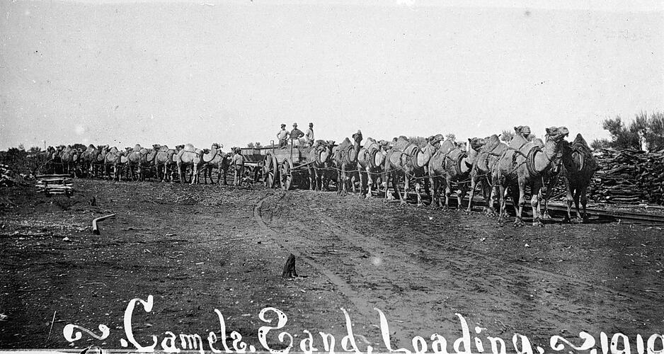 Two camel teams loading wood in Ooldea, South Australia. Dated to circa 1919. Ooldea was the source of wood for all stations across the Nullarbor plane. An inscription on the bottom reads 'Camels, Sand, Loading. 1919'.