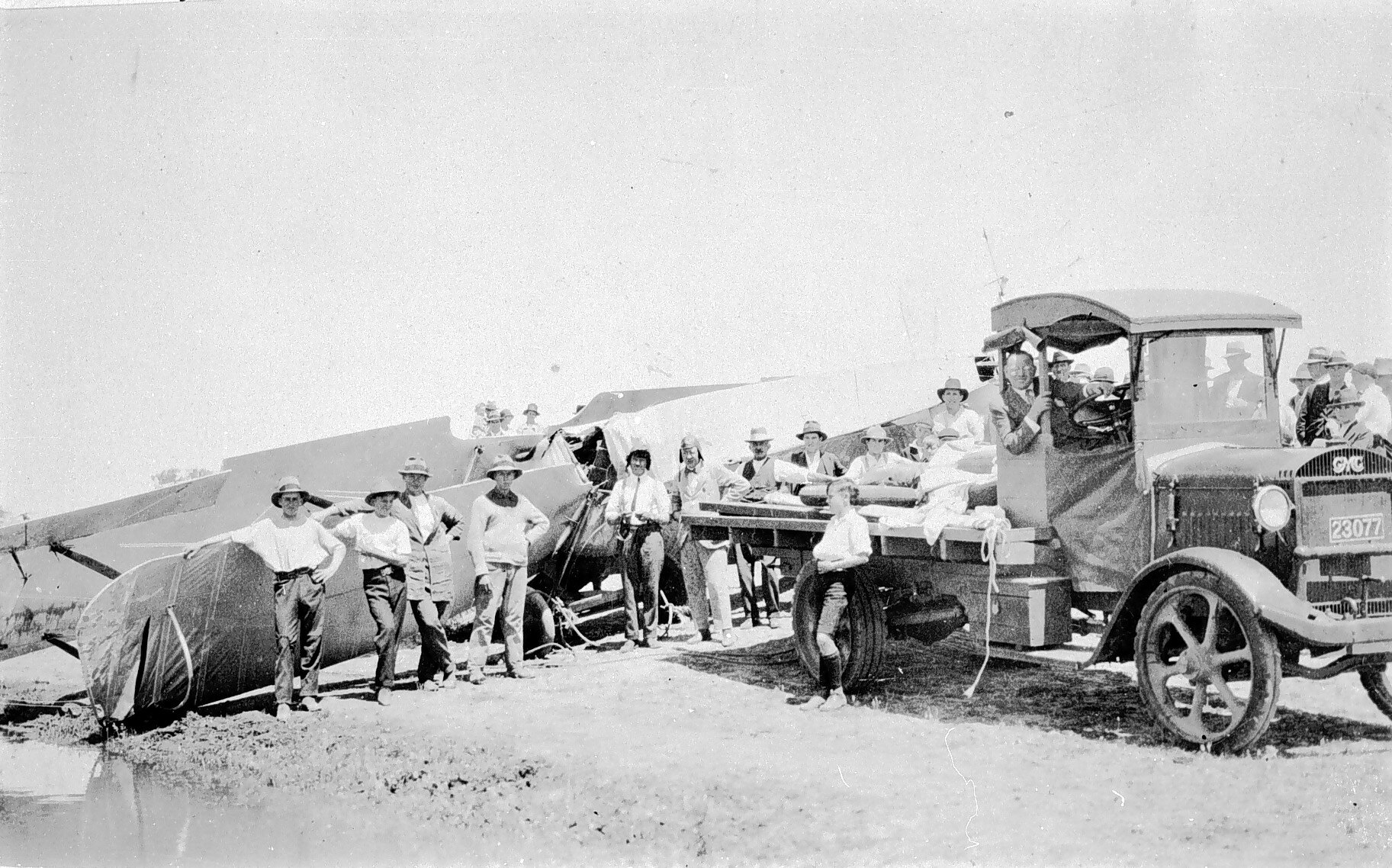 A GMC motor truck pulling a Curtiss JN-4D 'Jenny' plane (G-AUEV) from a dam following a crash near Wycheproof, Victoria. This accident took place in November 1927.