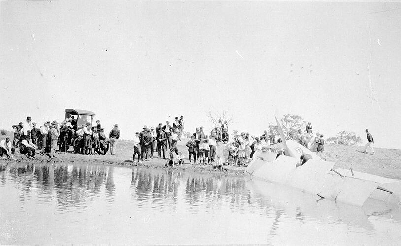 A plane crash in a dam near Wycheproof. The aircraft is a Curtiss JN-4D 'Jenny' G-AUEV which was first registered in July 1925. This accident occurred in November 1927.