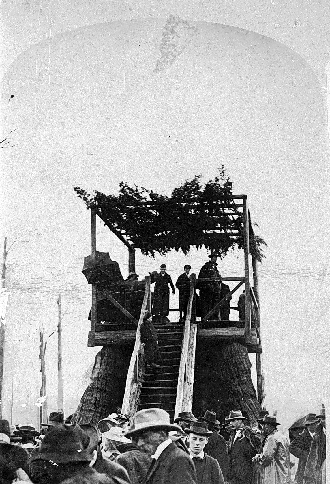 A large platform which has been constructed on top of a large tree stump. The platform is shaded by branches and there are a number of men on it. There is a large group of men surrounding the tree stump.