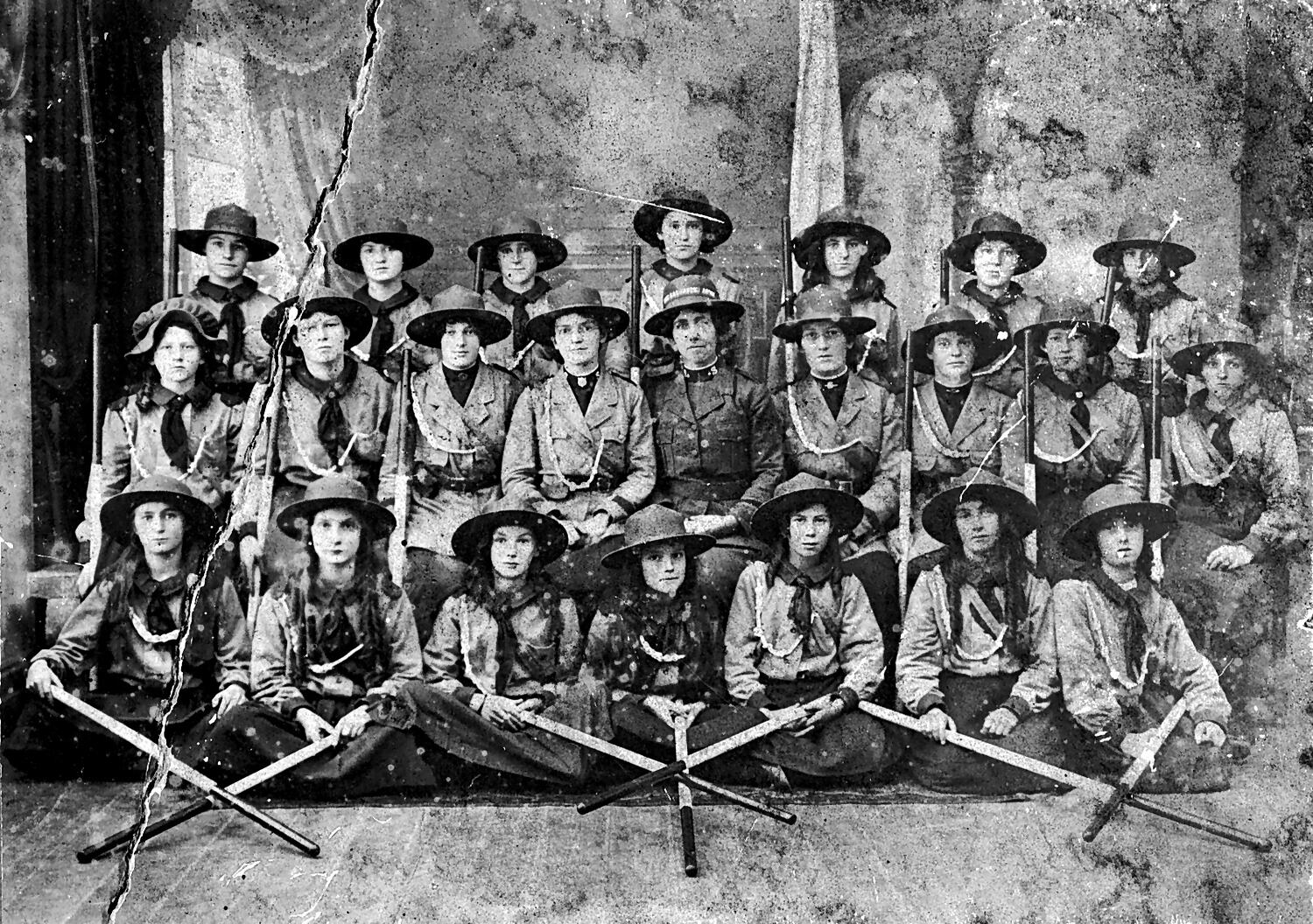A group photograph of members of the Salvation Army Girls Brigade. Each girl wears a scarf and a broad brimmed hat and carries a pole.