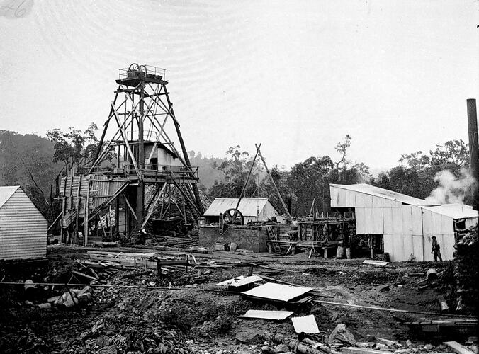 Gold mine at Diamond Creek. Sheds and a poppet head are visible.