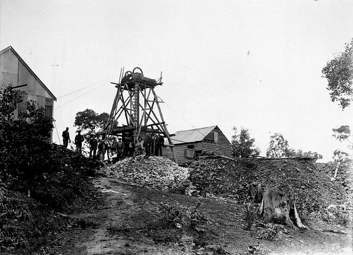 A gold mine at Diamond Creek. There is a group of men standing by a poppet head.