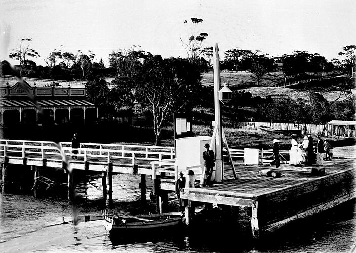 The pier and the Scarborough Hotel. There is a boat moored beneath the pier and there are a number of men and women on the pier.