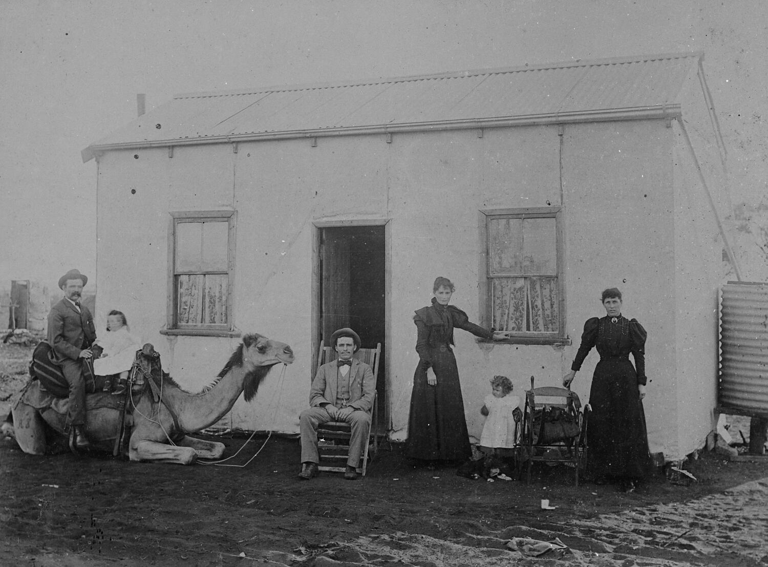 A group of people in front of a small, plain house in the Coolgardie District of Western Australia. On the left a man and a toddler sit on a kneeling camel, a man sits on a deck chair in front of the entrance while two women and another small child stand on the right. There is a water tank on the far right. The image was created by the W Roy Miller Studio in circa 1900.