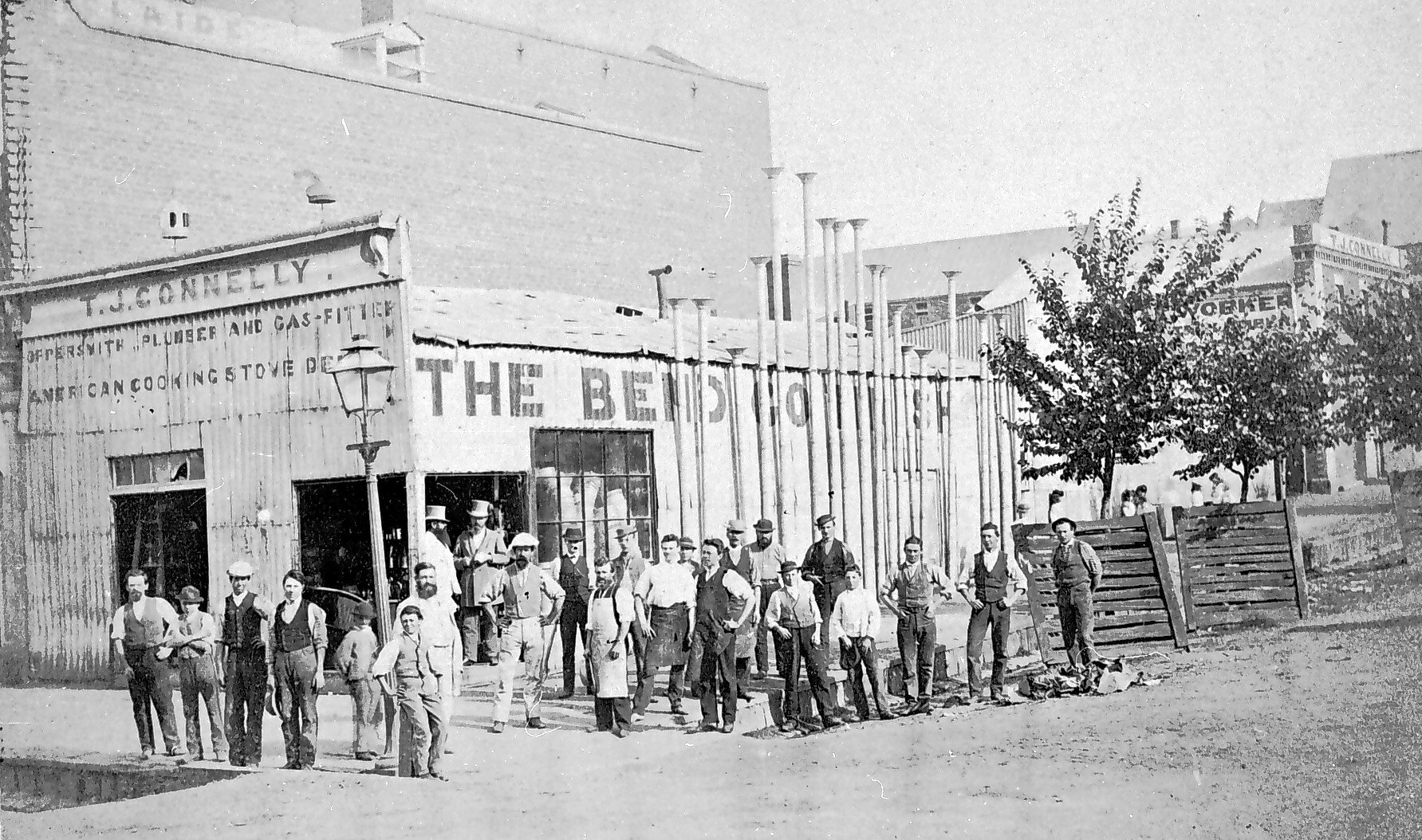 Workers outside the Bendigo Tin Shop, operated by T.J. Connelly.