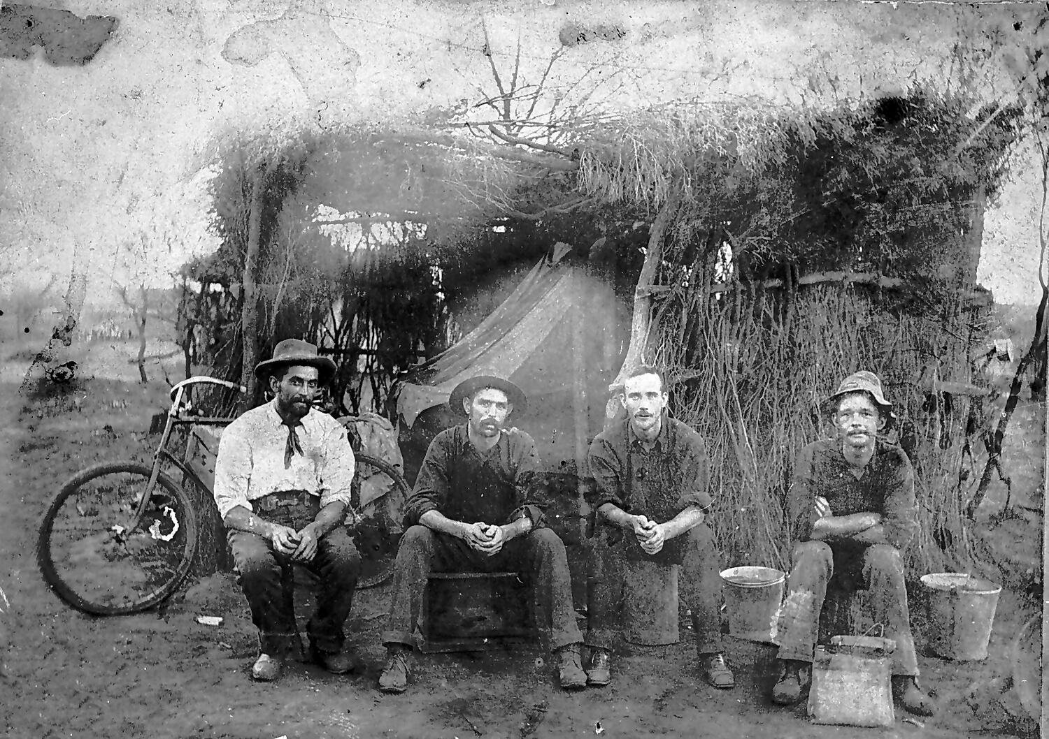 Miners sitting outside a tent which has been covered with branches. There is a bicycle beside the tent. This was at the North Star mine.