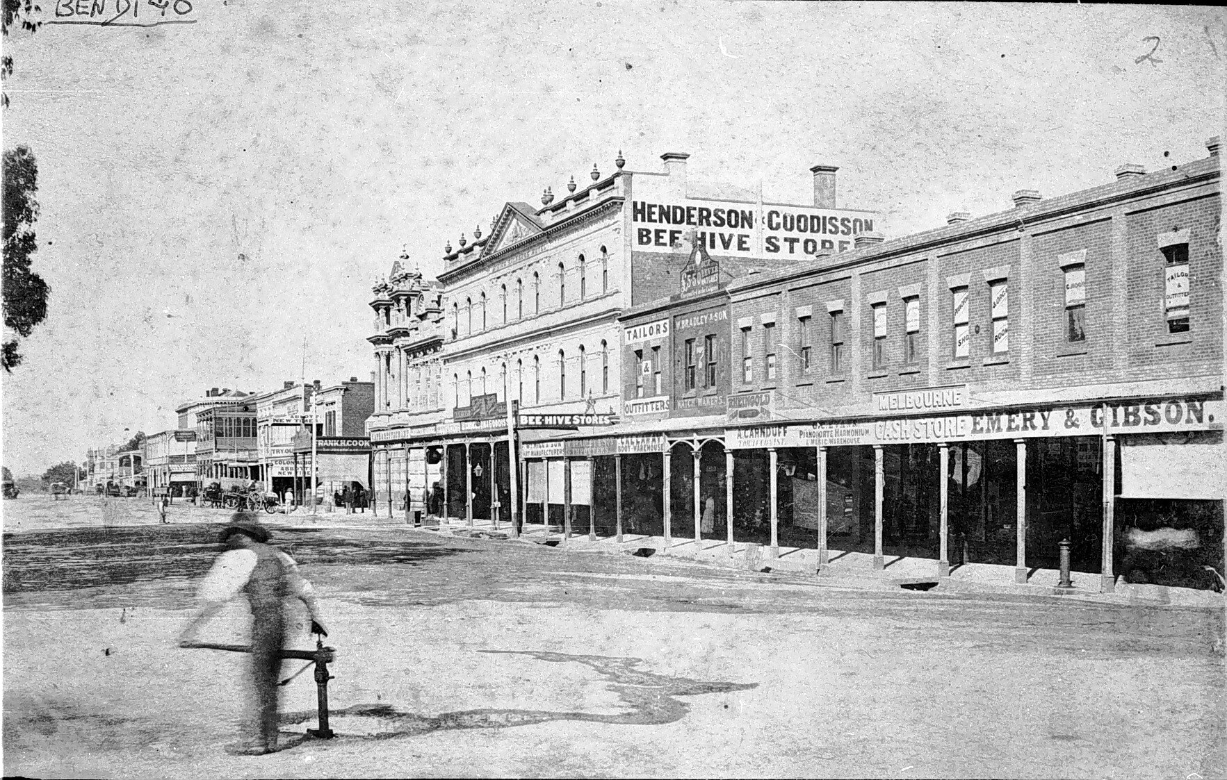 Pall mall with a man using a pump in the foreground. In the background are shops, including Henderson & Cuddisson 's Beehive Stores, Melbourne Cash Store, and Emery and Gibson.