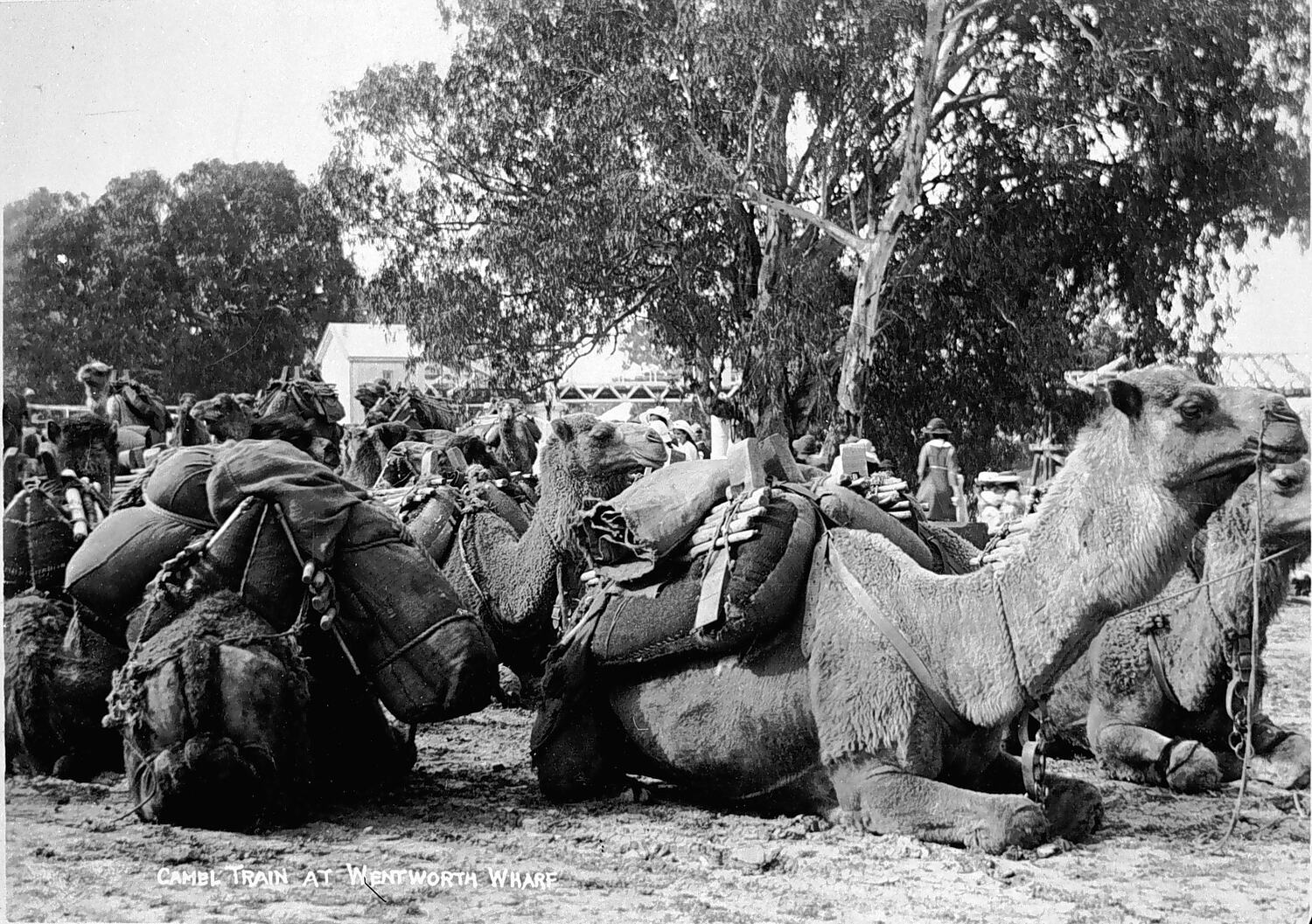 A camel train resting. The camels are all laden down with packs, and the area in which they rest is shaded by trees. An inscription at the bottom reads 'Camel train at Wentworth Wharf.'.