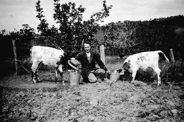 A man feeding two calves. He is holding his hat over the head of one calf.