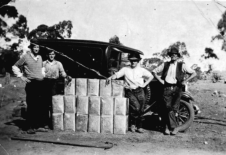 Beekeepers with tins of honey in front of a van.