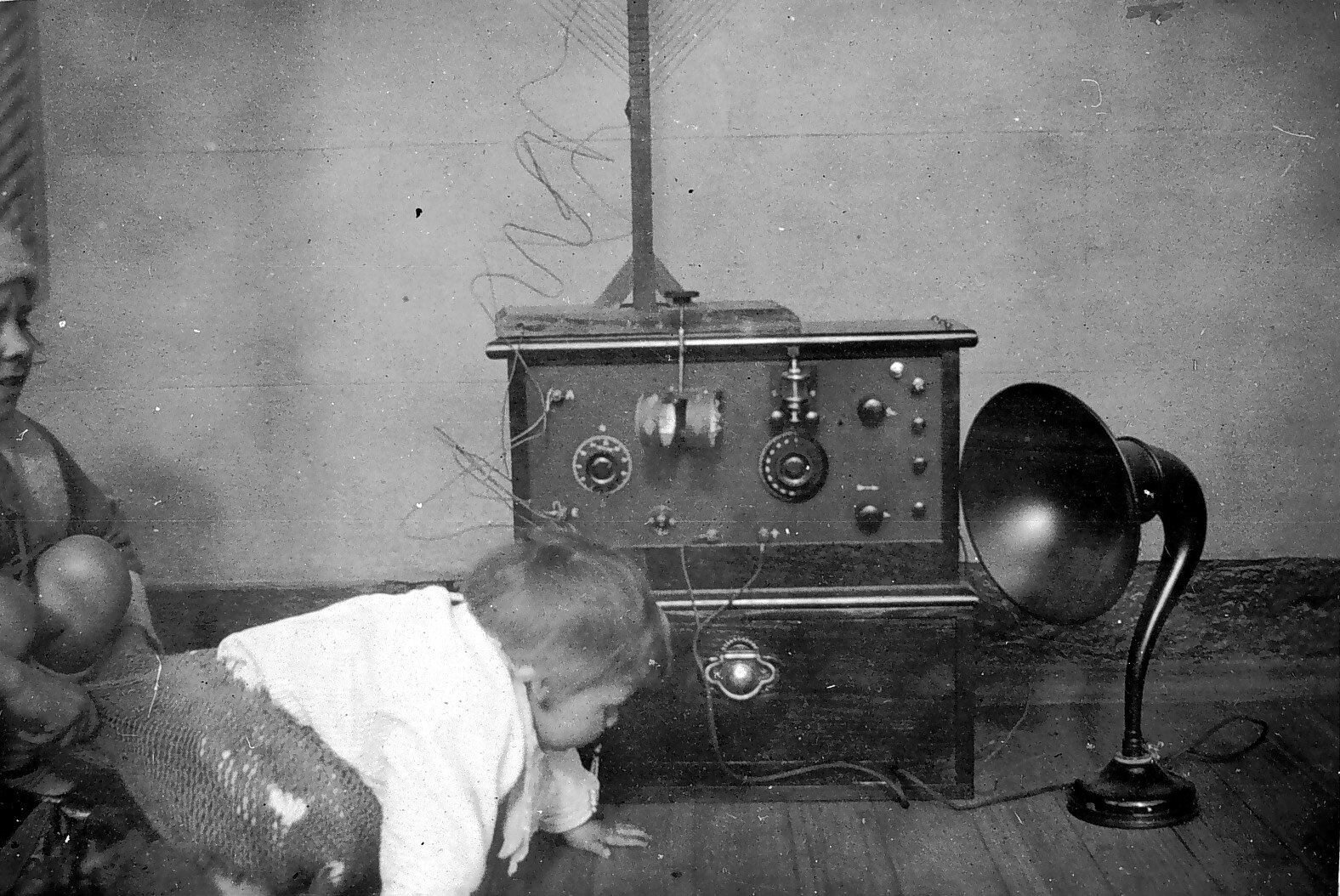An early Model valve radio. There is a baby on the floor in front of the radio while another child is visible on the left.