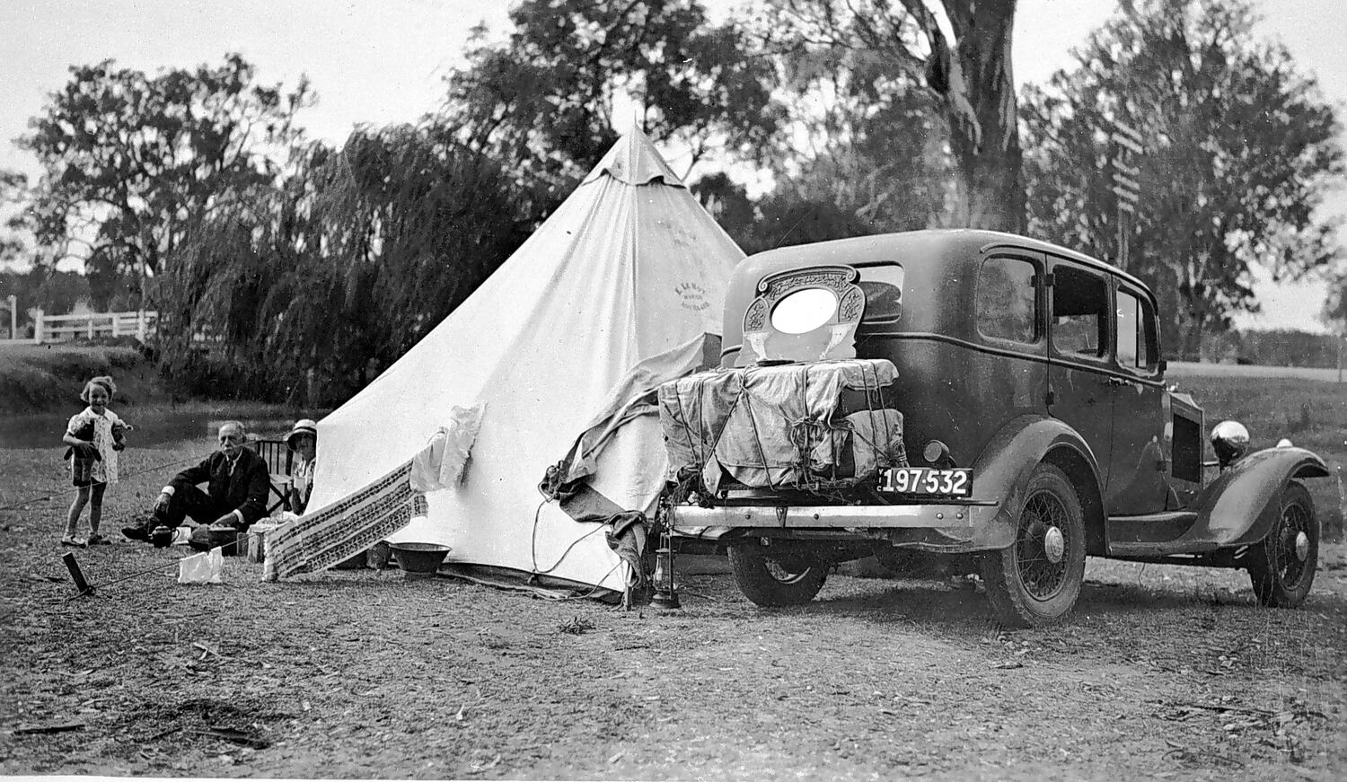 A motor car beside a tent. The mirror on the back of the car was used by the male campers for shaving. Towels are drying on a guy rope and a man, woman and child are sitting beside the tent.