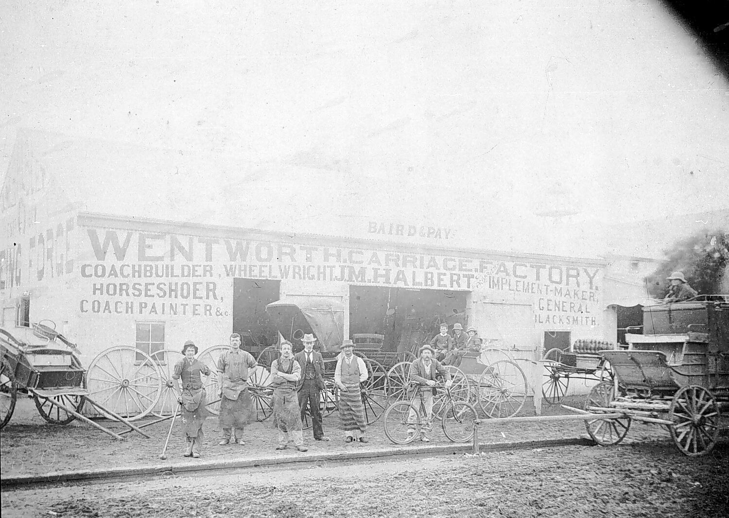 Staff outside the building of Baird & Pay 's Wentworth Carriage Factory. There is a coach on the right and a cart, buggy and carriage in front of the factory. This was the first factory operated by Baird & Pay. (See also MM 004305.).