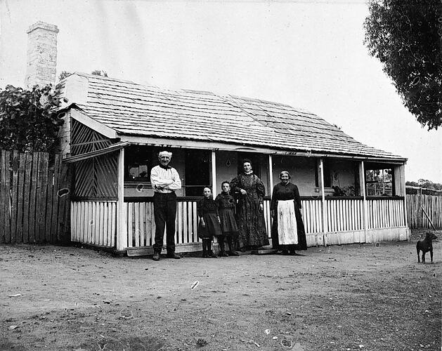 Family in front of Taradale House. A man, two girls and two women stand in front of a shingled roof house.