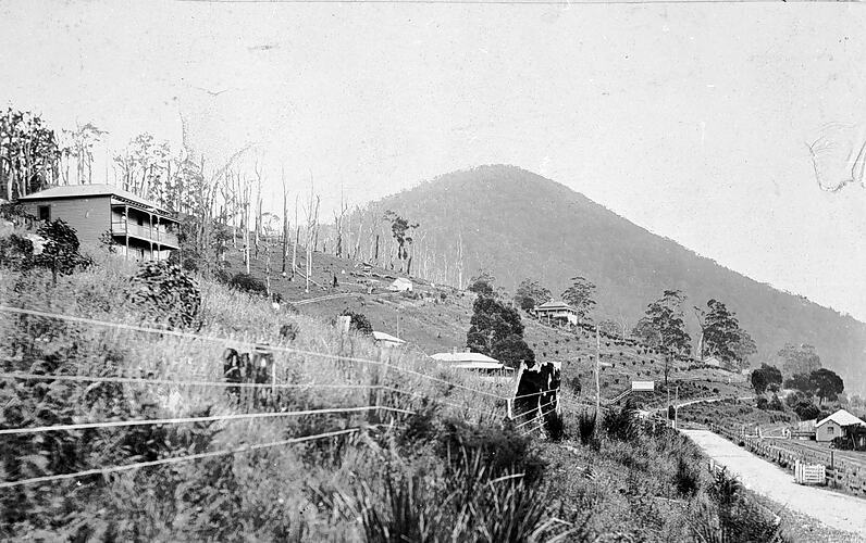Monochrome photograph from the O'Donnell family album of photographs which was copied by Museums Victoria under the Biggest Family Album project in 1987. The photograph shows the hills and mountains round Warburton.