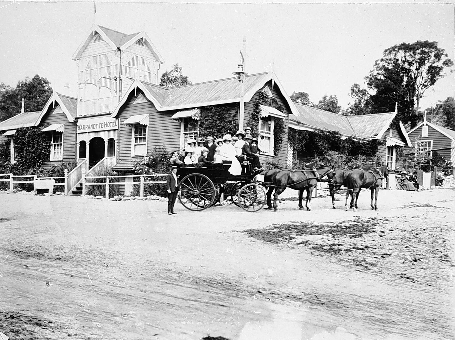 A group of people in a horse-drawn charabanc in front of the Warrandyte Hotel.