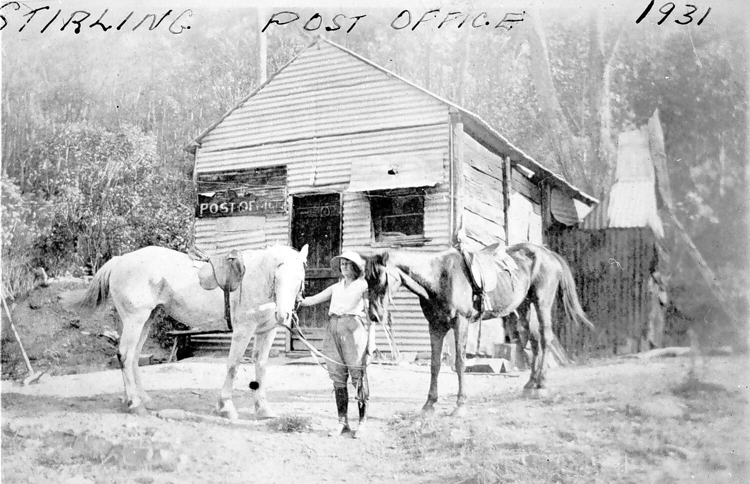 A woman wearing riding boots, jodhpurs (breeches) and a wide-brimmed hat, holding two horses by the reins, standing in front of the Old Stirling Post Office, in a bushland setting. The former post office is a simple single-gabled building constructed of timber and corrugated iron, with a split 'drop log' exterior wall and corrugated iron chimney on the right-hand side. There is a single wooden door in the centre of the facade, with a small serving window with overhead rainhood to the right of the door and a wooden signboard to the left of the door with a peeling fading label that reads: 'POST [crown symbol] OFFICE '.
