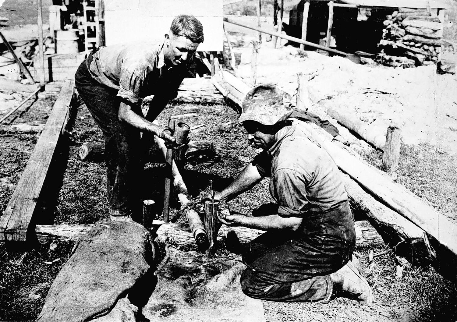 Men examining oil core from 1265 feet at the Tanjil O 'Neill bore.